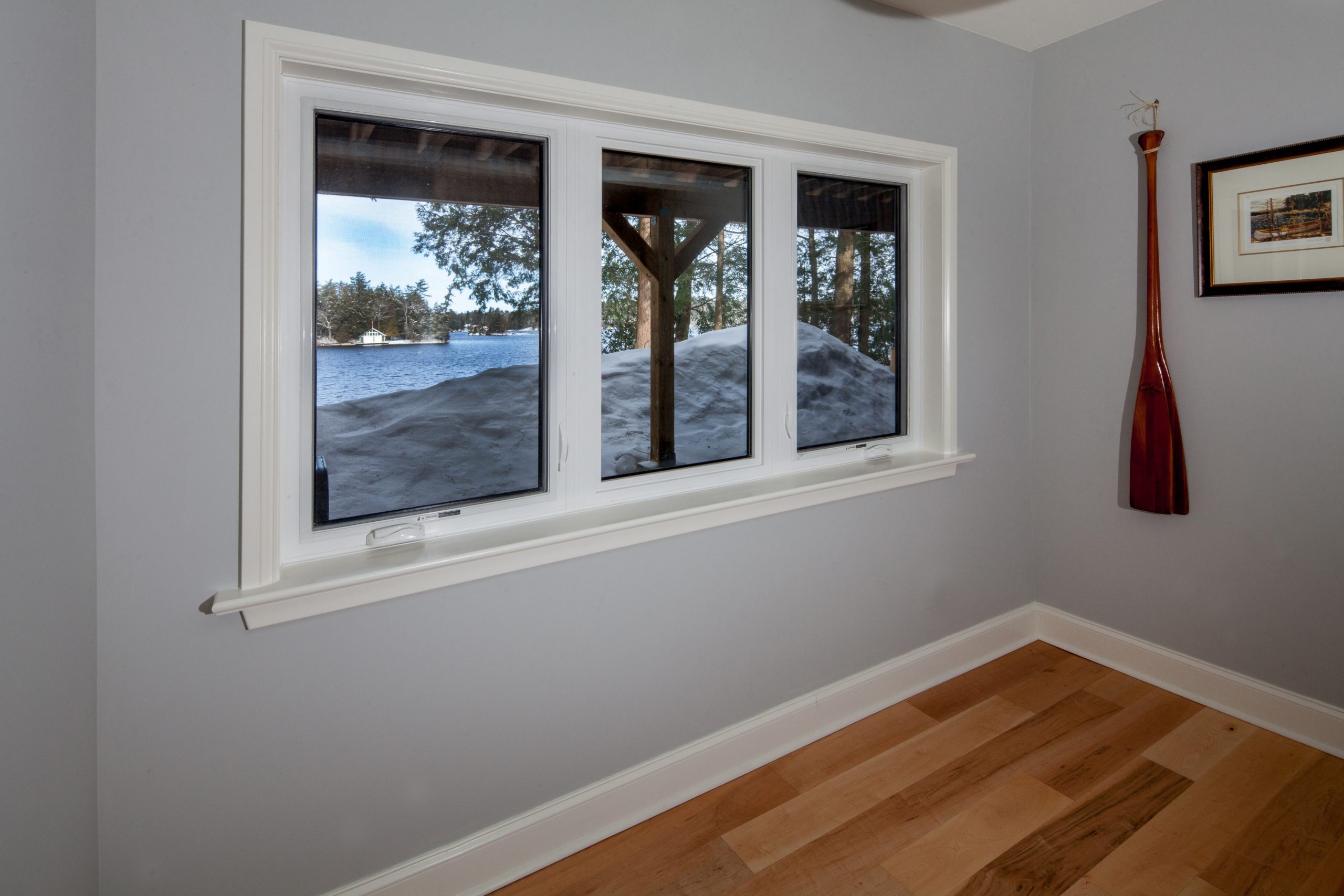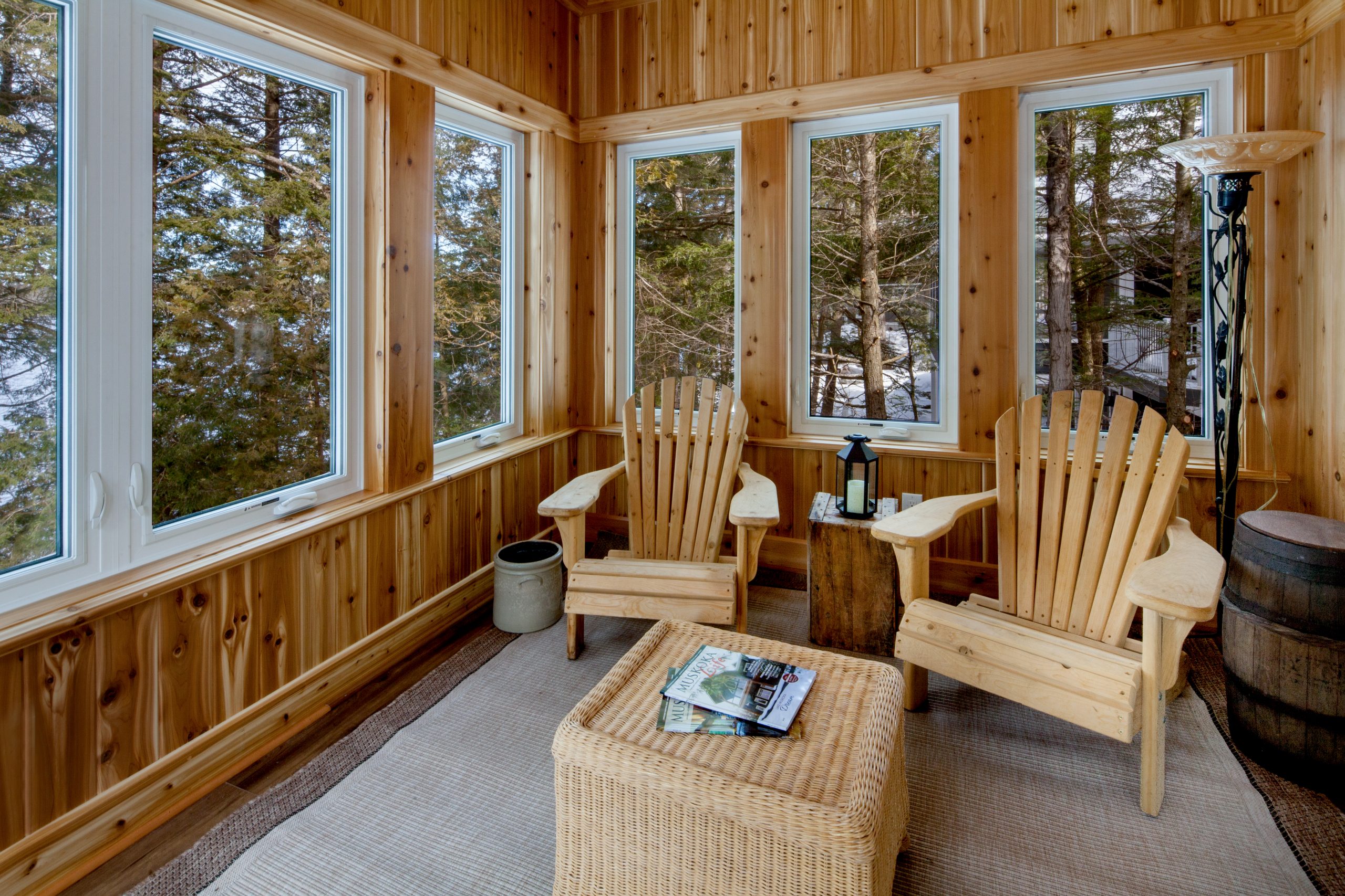 The glazed porch offers a cozy, year-round retreat surrounded by nature. Just off the main living space, the primary bedroom features large windows with lake views and access to a private deck. The home office provides a quiet, light-filled workspace, while the lower level extends the living space with a second family room and walk-out access to the surrounding landscape.