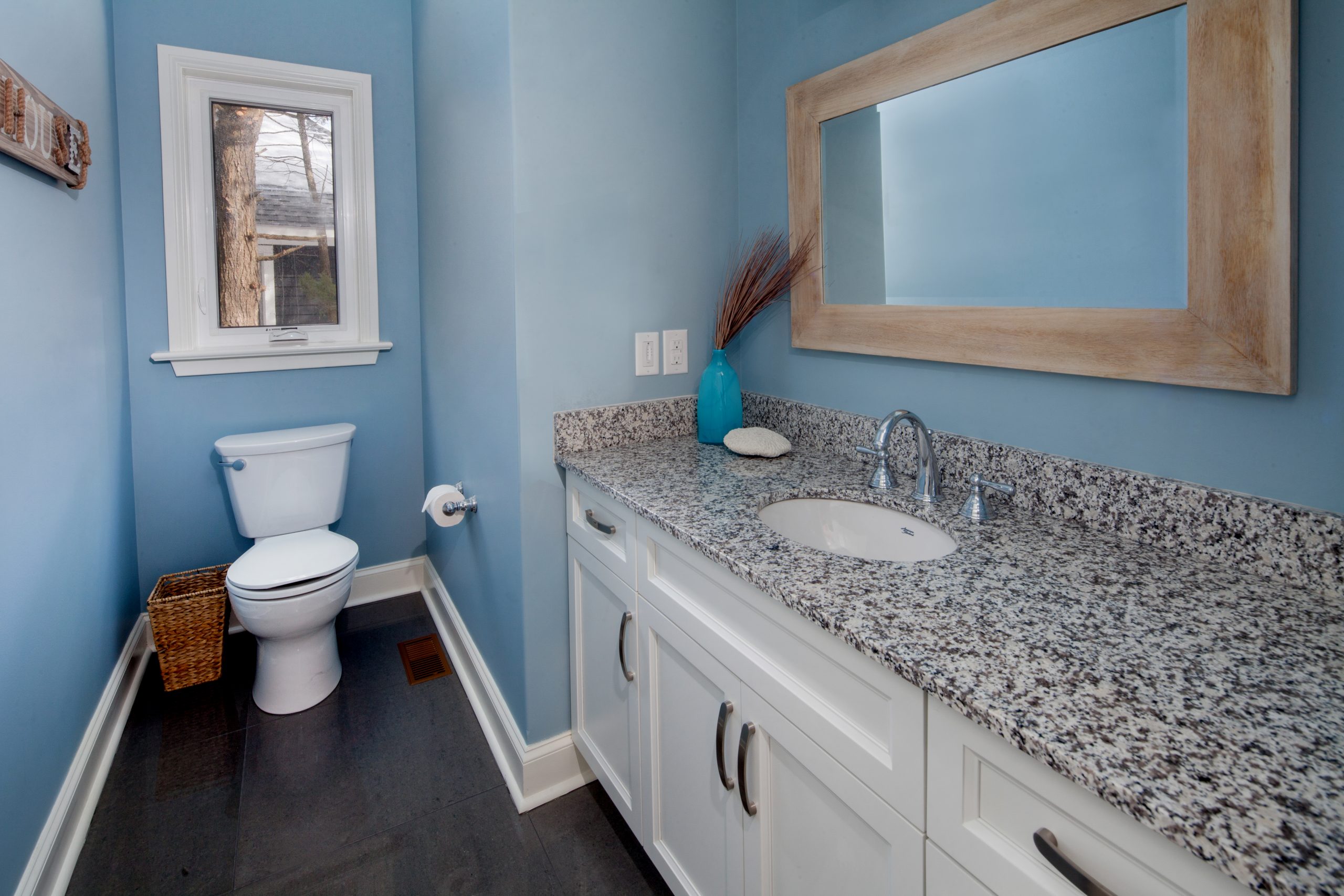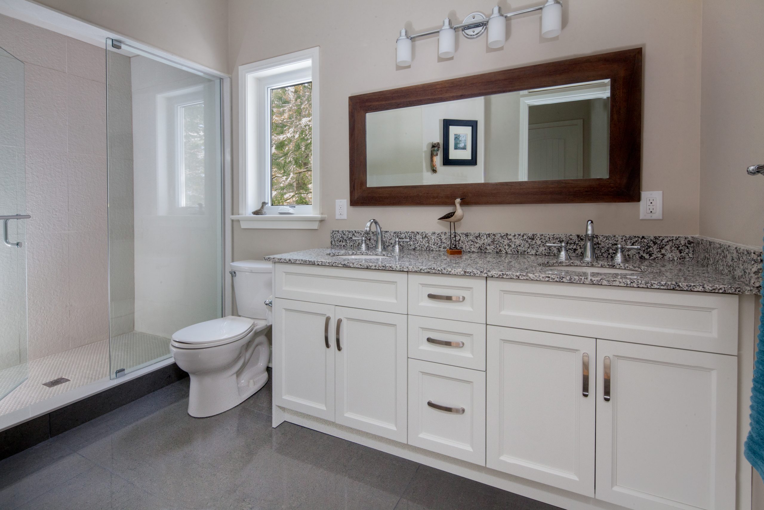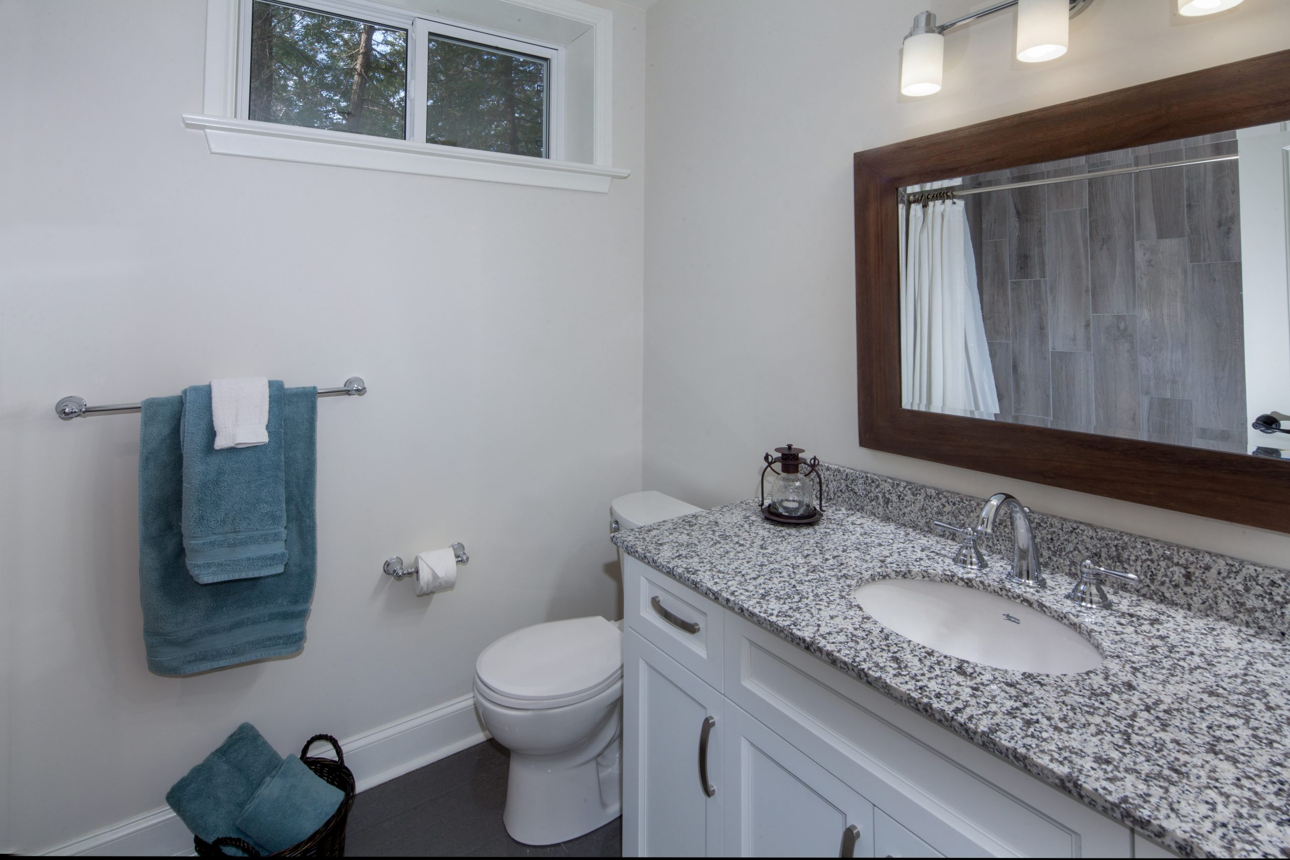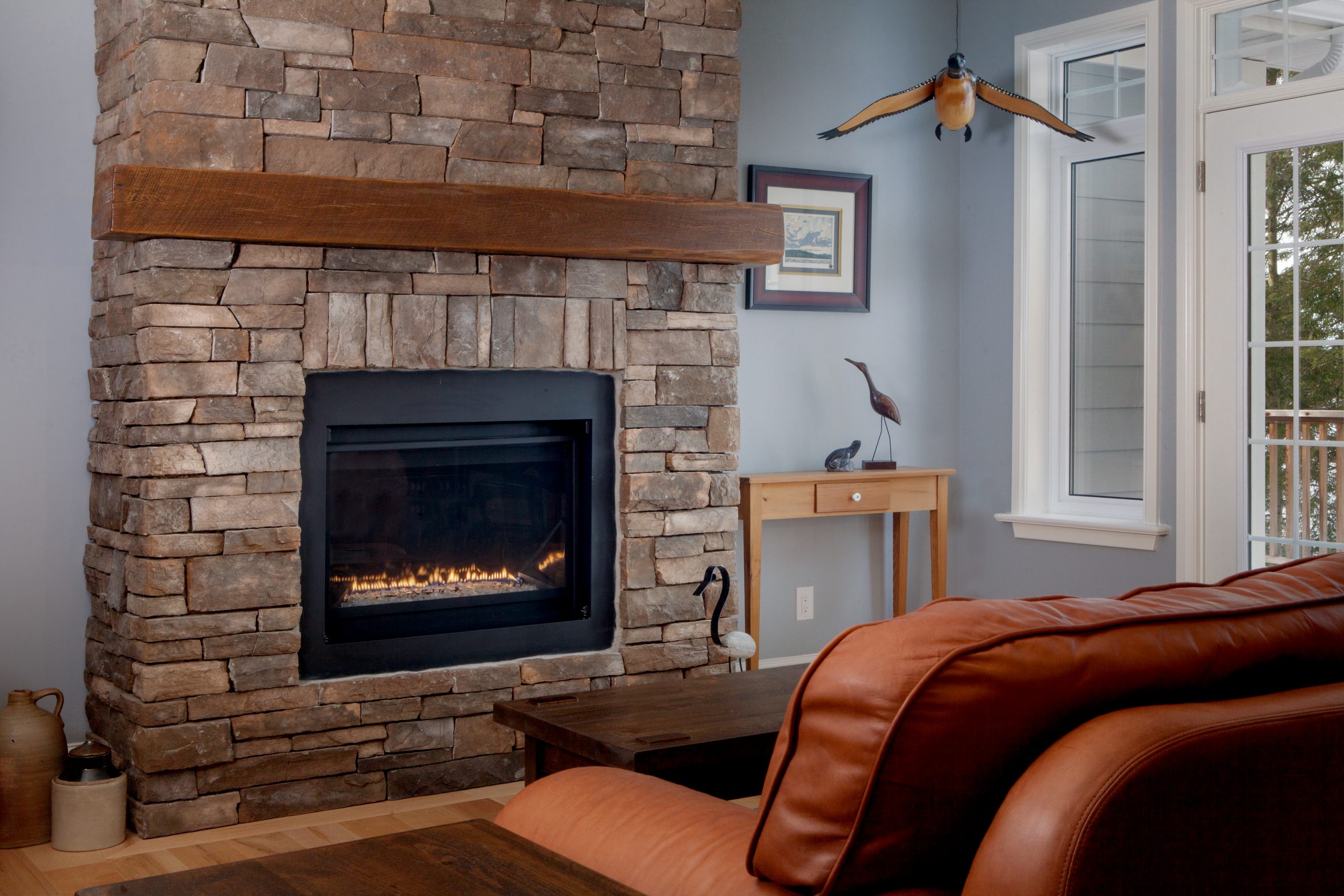 The interior palette reflects a clean and refined aesthetic, combining warm-toned hardwood flooring with a stone-clad fireplace and rustic wood mantle. The kitchen features granite countertops and modern white cabinetry, complemented by brushed metal fixtures and statement lighting. Throughout the home, soft gray and natural wood accents tie the spaces together with a sense of understated elegance.