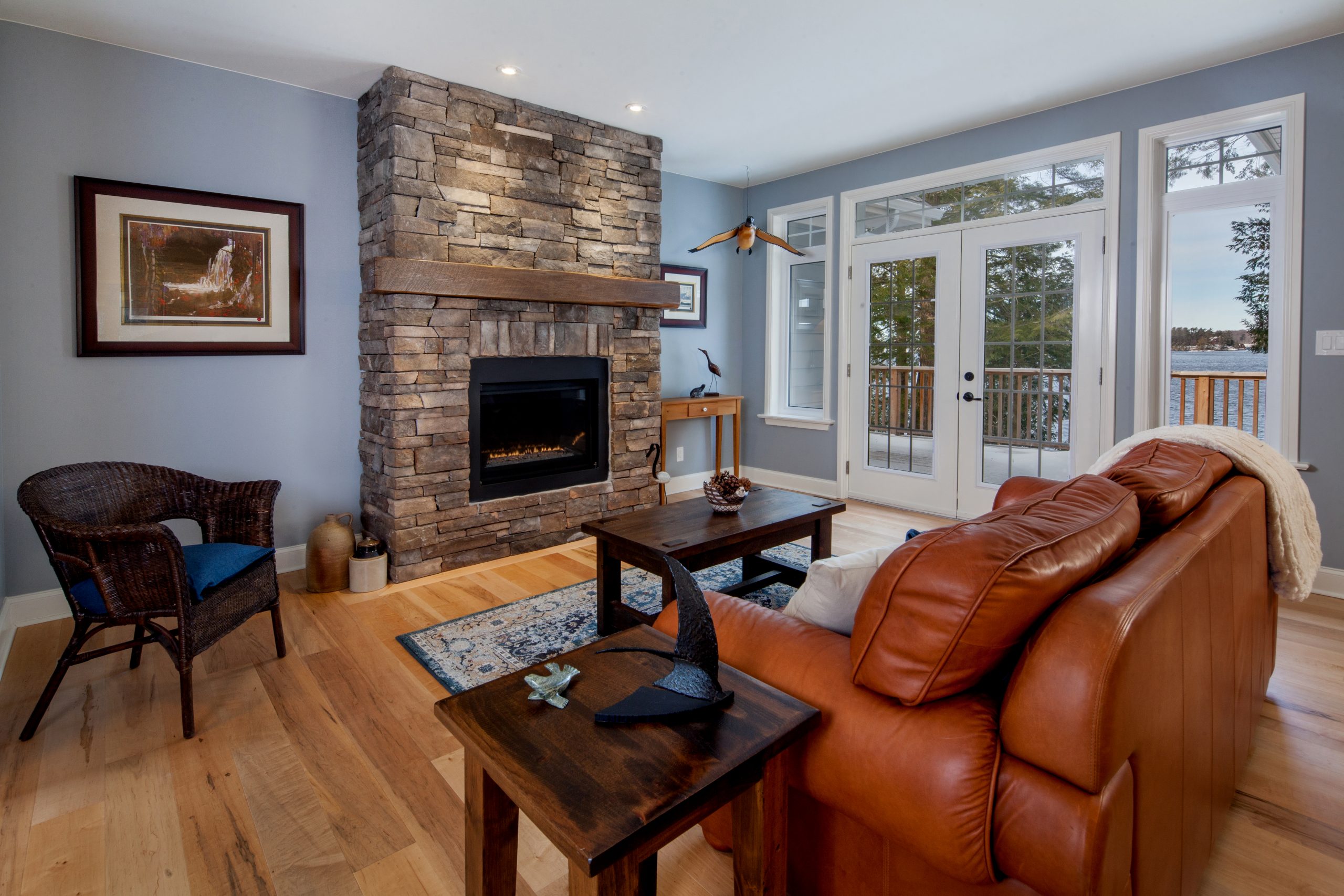 On the main floor, a natural stone fireplace anchors the open-concept great room, which flows seamlessly into a spacious kitchen and dining area. Large windows and glass doors allow natural light to flood the space while showcasing the forest and lake views. Vaulted ceilings, wide-plank hardwood flooring, and soft, neutral walls create a harmonious and relaxed atmosphere.
