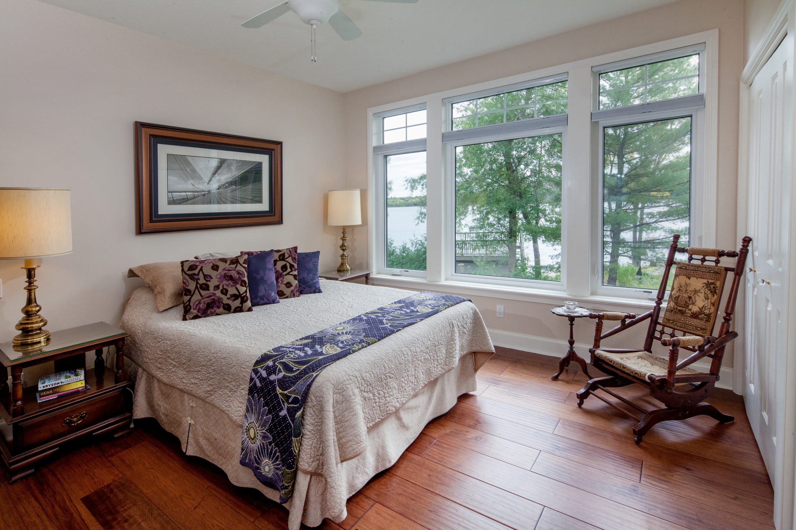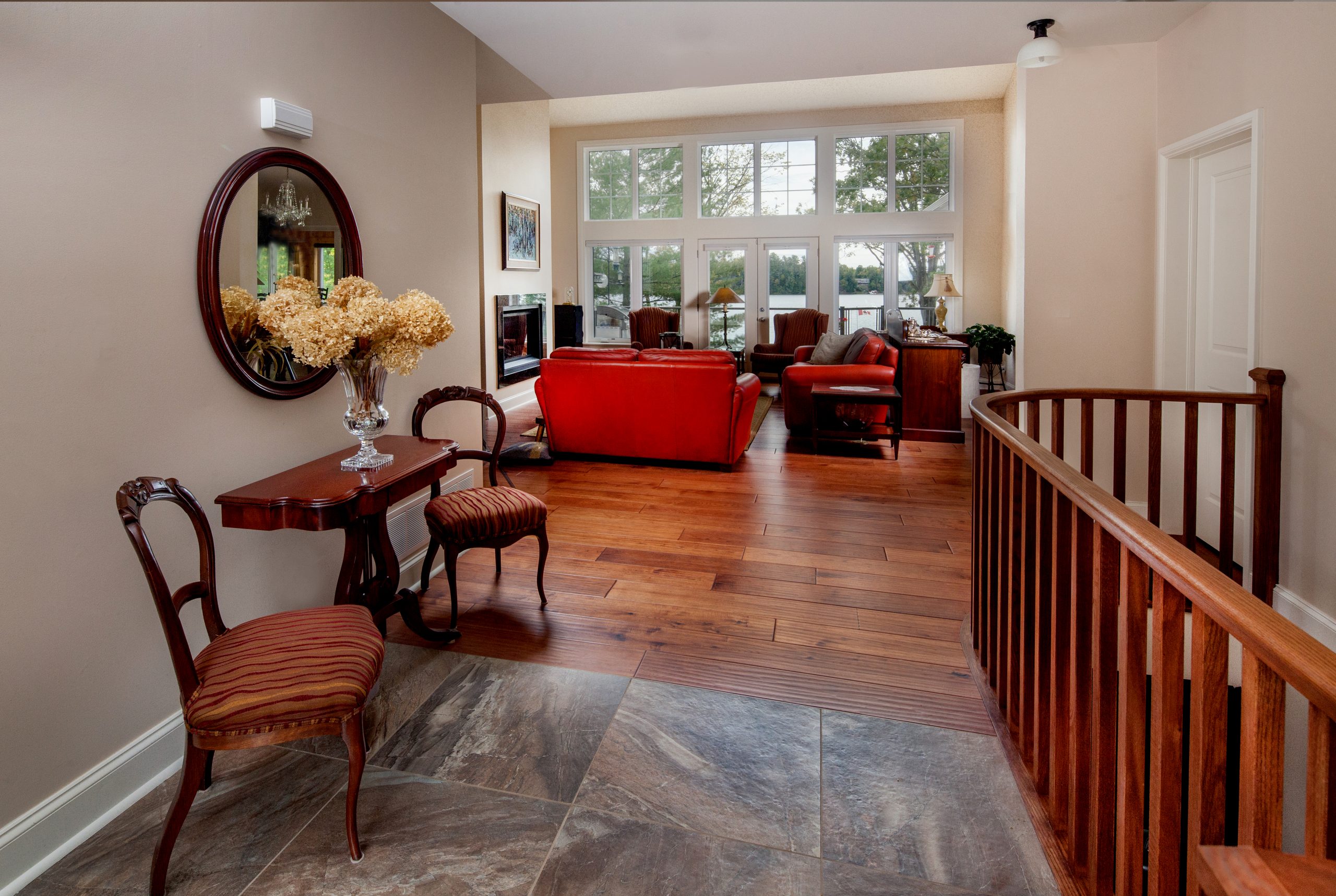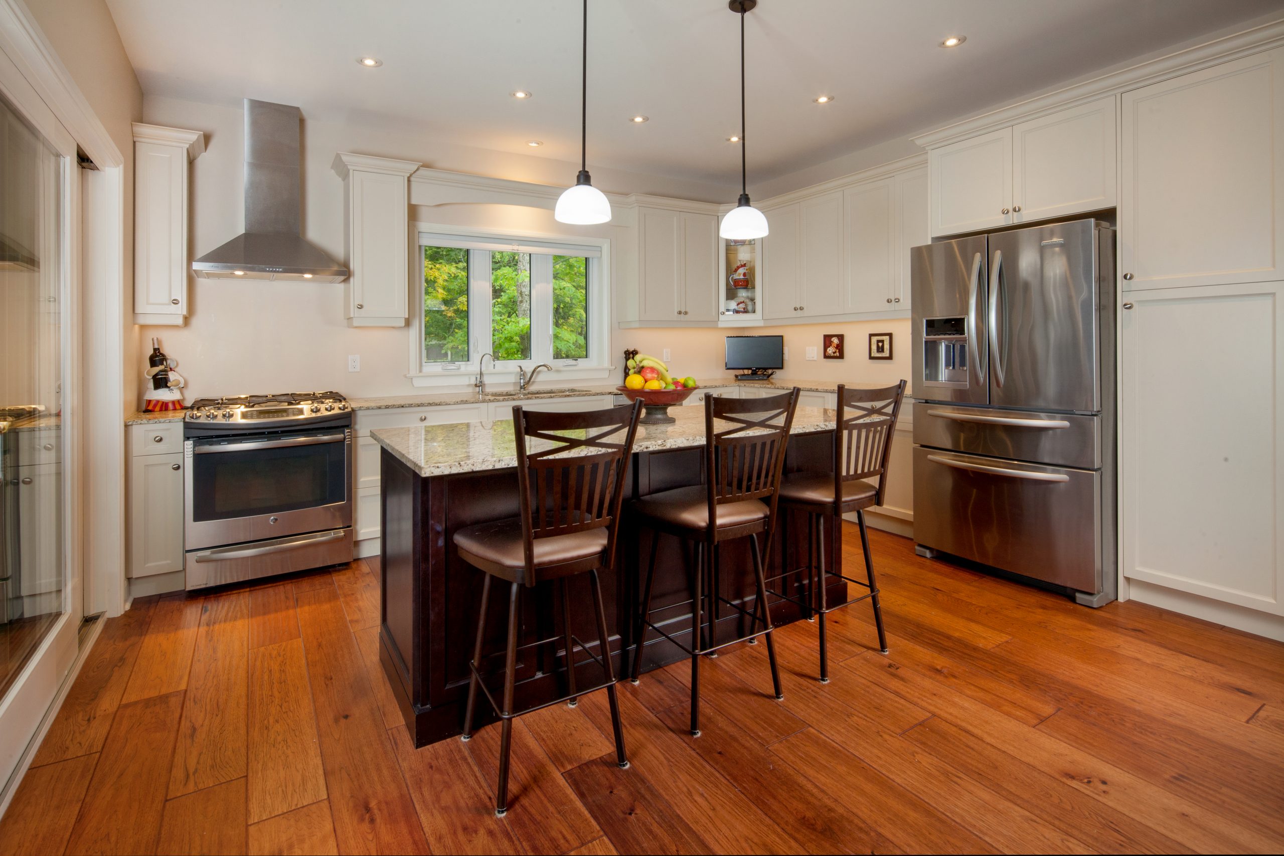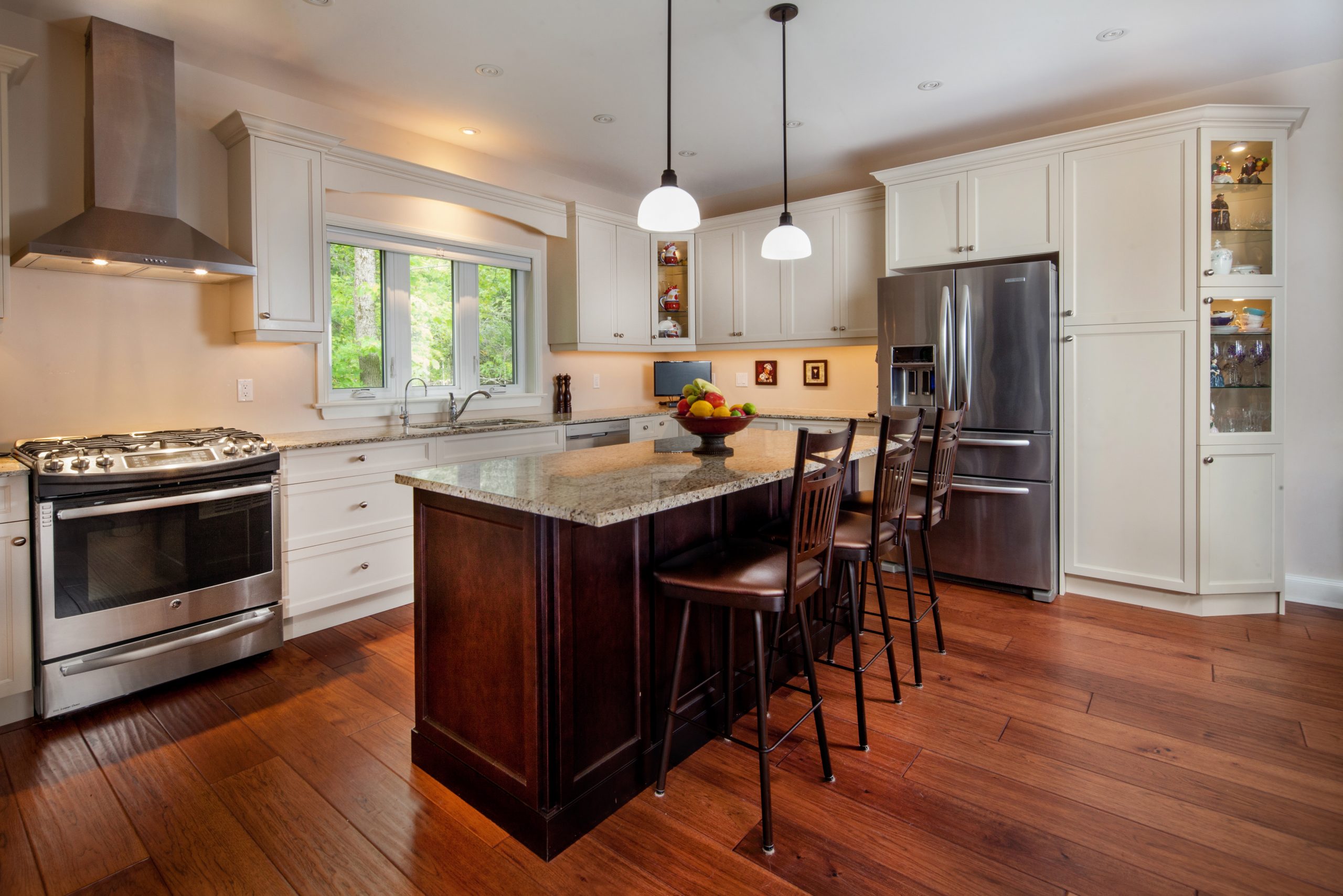 Across both levels, carefully chosen materials deliver elegance and practicality. Wide‑plank hardwood floors unify the space underfoot; granite countertops anchor the gourmet kitchen; modern white cabinetry keeps the aesthetic fresh and clean. Brushed metal fixtures, statement lighting, and natural wood accents bring subtle sophistication, while large windows and doors invite the outdoors in.